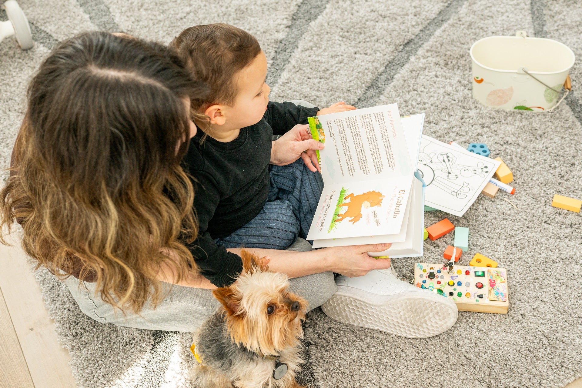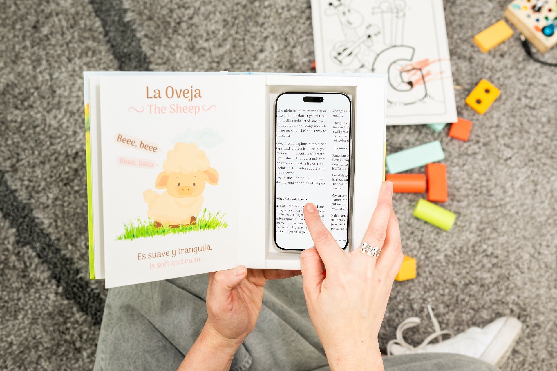 Phoney is a bilingual (English–Spanish) tool that looks like a board book designed to help parents of babies and toddlers gently reduce how much their children see them using a phone.